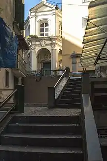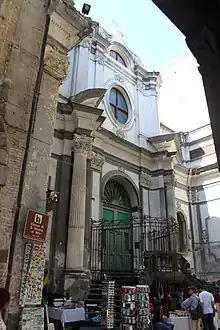 De nombreux édifices religieux sont précédés d'un escalier-parvis, une solution due aux aspects symboliques et techniques. Du point de vue symbolique, il représente la séparation entre le monde extérieur laïque et profane avec le monde spirituel et sacré de l'église et du couvent. L'aspect technique fait de l'escalier l'élément avec lequel il est possible de gravir la pente naturelle du sol de la ville. En fait, en raison de la morphologie escarpée de Naples, les églises ont été construites sur de vrais travaux de terrassement, et reliées au niveau inférieur par l'intermédiaire d'une série d'escaliers. En même temps, les escaliers peuvent servir à donner davantage d'élan à la structure, en soulignant aussi bien la valeur architecturale que la symbolique.