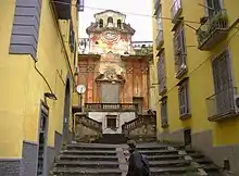 La Chiesa di Santa Maria la Nova (it) (construite entre 1596 et 1599 en style renaissance tardive, mais avec des influences maniéristes, avec des interventions par la suite d'essence baroque) montre un système similaire à celui de l'église de la via Scura. Le parvis est précédé de deux rampes d'escaliers, mais celle de droite est quasiment deux fois plus longue que celle de gauche, à cause de la l'orientation du terrain.