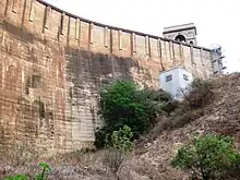 Une route goudronnée longe la rive nord, passe près du mur. Un tunnel de 56,6 m de long permet de passer au travers le mur du barrage