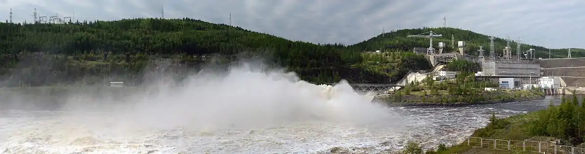 Deux usines électriques avec chacune leur canal d'amenée ont été construites, la première sur la rive droite et la seconde sur la rive gauche. Pour alimenter la première centrale électrique, l'eau est acheminée par un canal d'amenée dans lesquels sont situées des prises d'eau alimentant par plusieurs conduites les turbines situées dans une galerie profonde dans la roche. Le déversoir situé dans le prolongement du canal d'amenée est d'une largeur de 40 mètres, a une capacité de 4 830 m3/s et est fermé par des vannes à plusieurs segments de 14 mètres de hauteur. La deuxième usine électrique est alimentée par un canal distinct situé sur l'autre rive et est construite dans une excavation réalisée sur la rive[6]. Des lignes électriques à haute tension alimentent en énergie électrique Mirny et les agglomérations minières (Oudatchny et Aïkhal situées 400 kilomètres au nord[7].