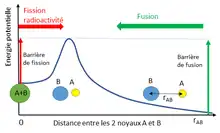 - la barrière de fission : lorsqu’un noyau fissionne en deux noyaux fils, la hauteur de la barrière se mesure par rapport à l’énergie potentielle du noyau initial dans son état fondamental. Ce processus vaut aussi bien pour la fission des noyaux très lourds, que pour la radioactivité alpha, qui correspond à une fission dont un des noyaux fils est un noyau d’He4.