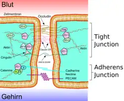 Pour éviter toute fuite incontrôlée, les cellules endothéliales sont liées par des jonctions serrées étanches. Seules de toutes petites molécules peuvent passer à travers les jonctions serrées : eau, glycérine ou urée[20].