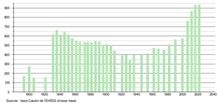L'évolution du nombre d'habitants est connue à travers les recensements de la population effectués dans la commune depuis 1793. Pour les communes de moins de 10 000 habitants, une enquête de recensement portant sur toute la population est réalisée tous les cinq ans, les populations légales des années intermédiaires étant quant à elles estimées par interpolation ou extrapolation[42]. Pour la commune, le premier recensement exhaustif entrant dans le cadre du nouveau dispositif a été réalisé en 2006[43].