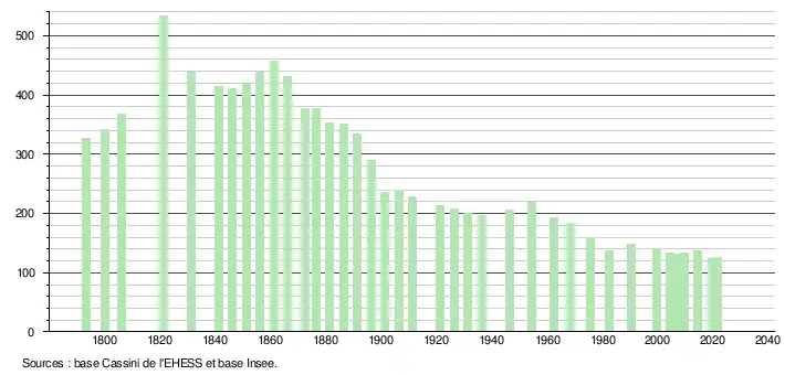 Le nombre d'exploitations agricoles en activité et ayant leur siège dans la commune est passé de 27 lors du recensement agricole de 1988[Note 8] à 18 en 2000 puis à 19 en 2010[31] et enfin à 14 en 2020[Carte 6], soit une baisse de 48 % en 32 ans. Le même mouvement est observé à l'échelle du département qui a perdu pendant cette période 51 % de ses exploitations[32],[Carte 7]. La surface agricole utilisée sur la commune a également diminué, passant de 1 121 ha en 1988 à 943 ha en 2020[Carte 8]. Parallèlement la surface agricole utilisée moyenne par exploitation a augmenté, passant de 42 à 67 ha[31].