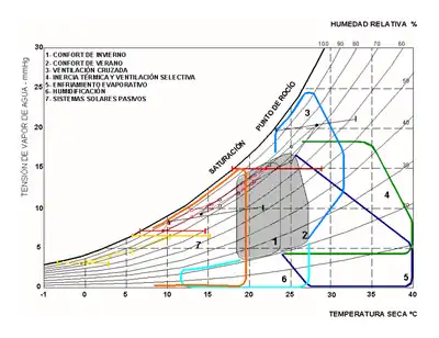 Il présente également d'autres zones où est il est possible d'obtenir du confort moyennant l'application de stratégies de conception passive (mise en place de brasseurs d'air plafonniers par exemple). En dehors de ces zones, l'usage de systèmes de conditionnement d'air apparaît nécessaire pour le chauffage ou pour la [[réfrigération|réfrigération[réf. souhaitée]]].
