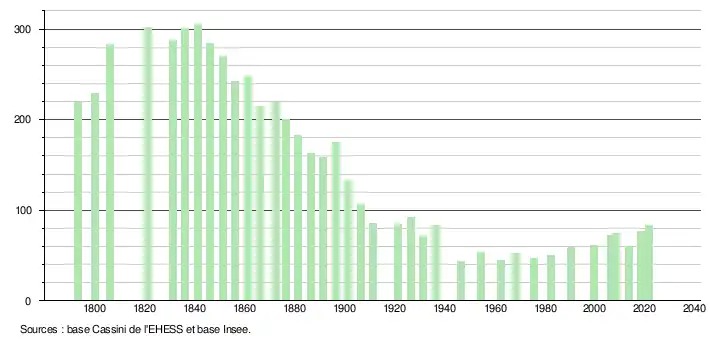 L'évolution du nombre d'habitants est connue à travers les recensements de la population effectués dans la commune depuis 1793. Pour les communes de moins de 10 000 habitants, une enquête de recensement portant sur toute la population est réalisée tous les cinq ans, les populations légales des années intermédiaires étant quant à elles estimées par interpolation ou extrapolation[19]. Pour la commune, le premier recensement exhaustif entrant dans le cadre du nouveau dispositif a été réalisé en 2008[20].