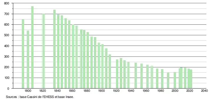 L'évolution du nombre d'habitants est connue à travers les recensements de la population effectués dans la commune depuis 1793. Pour les communes de moins de 10 000 habitants, une enquête de recensement portant sur toute la population est réalisée tous les cinq ans, les populations légales des années intermédiaires étant quant à elles estimées par interpolation ou extrapolation[21]. Pour la commune, le premier recensement exhaustif entrant dans le cadre du nouveau dispositif a été réalisé en 2008[22].