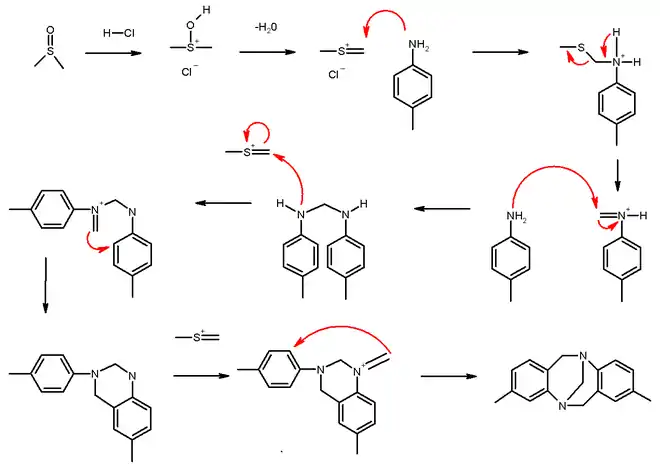 Le mécanisme réactionnel avec la DMSO comme donneur de méthylène ressemble au réarrangement de Pummerer. La réaction du DMSO avec l'acide hydrochloreux produit un ion sulfonium électrophile qui à son tour réagit par addition électrophile avec l'amine aromatique. le méthanethiol est éliminé et l'imine produite réagit avec une deuxième amine. L'addition et l'élimination d'ion sulfonium reprend avec le second groupe amine et le groupe imine réagit par substitution électrophile aromatique intramoléculaire. La production d'imine intervient une troisième fois, puis la réaction se termine avec une dernière substitution électrophile vers l'autre cycle aromatique.