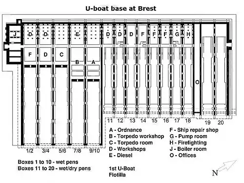 Le premier U-Boot arrive à Brest en août 1940. Il s'agit de l'U-65 (Type IX-B). D' à , la base accueille environ 134 U-Boote différents, ainsi que deux sous-marins italiens et un sous-marin japonais[2]. Au plus fort de la bataille de l'atlantique, en , ils sont jusqu'à 26 U-Boote à séjourner en même temps[2]. Ces U-Boote ont participé à toutes les campagnes de l'arme sous-marine allemande, du nord au sud de l'Atlantique jusqu'aux côtes américaines[2].