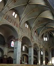 Dans notre marche vers Marie, nous ne sommes pas seuls : dans la nef les Saintes Femmes, les vierges et les martyrs, lessSaints fondateurs, les saints prêtres et évêques ; dans le chœur, la voûte est ornée des mystères de la vie de Marie et de Jésus : Marie vénérée par les anges, la Présentation de Marie, la Visitation, La Présentation de Jésus, le Couronnement de Marie au Ciel, l’Annonciation, la Nativité, Jésus retrouvé au temple, la Montée de Marie au Ciel.