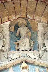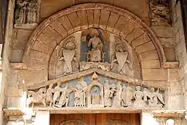 Au-dessus de la porte, dans le linteau en bâtière on peut reconnaître l'histoire de l'enfance du Christ : adoration des mages, présentation au temple, et baptême de Jésus, dans lesquels on retrouve des traces de polychromie ancienne. Au-dessus, dans un arc de décharge un Christ pantocrator est entouré par deux séraphins. Ses pieds reposent sur un lion et un taureau symbolisant les évangélistes Marc et Luc. En haut à gauche se développe une représentation de l'Annonciation (à gauche) et une Nativité (à droite).