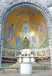 La Vierge Marie est figurée sur une mosaïque monumentale décorant la voûte en cul-de-four du chœur, dont le dessin est dû à Edgard Maxence ; entourée de nombreux anges, bras ouverts, elle présente un geste d'accueil aux pèlerins, accompagnée de la devise qui manifeste son intercession : « Par Marie à Jésus ».