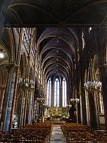 L'élévation intérieure comprend les grandes arcades, un triforium aveugle et les fenêtres hautes.
