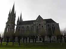 Construite en granit dans le style néo-gothique, elle comporte de grandes verrières colorées, réalisées en plusieurs campagnes du XIXe au XXe siècle. Les deux tours de la façade abritent un carillon de 39 cloches.