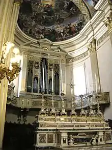 La tribune de l'orgue, remplacée en 1890 par le retable placé près d'un siècle plus tôt par l'abbé Giuseppe Ferrari Bonini, est l'œuvre de Luigi Samoggia qui est à l'origine des plaques dorées ou des pièces qu'il a délibérément mal collées dans les piliers, les coupant en deux et lui enlevant son élégance.