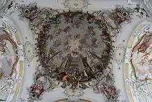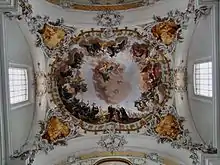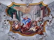 La grande fresque de la partie nord montre une Glorification de saint Benoît et de son ordre[11]. Aux quatre extrémités de la fresque, de petites fresques rejoignent les piliers, et en dessous des figures en stuc. Parmi ces fresques, celle de l'extrémité nord-est montre Benoît et des donateurs. La fresque du transept représente la Pentecôte[12]. On voit la disposition traditionnelle de Marie entourée des apôtres, et le Saint Esprit qui les éclaire. Enfin, la fresque du chœur[13] représente les Neuf chœurs d'anges.