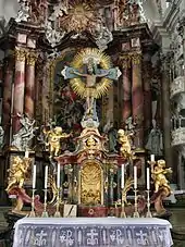 Le sanctuaire du chœur contient un maître-autel de hauteur impressionnante. Le panneau central montre une trinité, avec un globe terrestre aux pieds de Jésus. Deux statues représentent Pierre et Paul plus grands que nature.