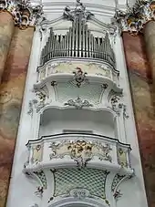 L'orgue de la Trinité (ou orgue de l'épître) et l'orgue du Saint Esprit (ou orgue de l'évangile[21]) ont été construits en 1766 par le facteur d'orgues Charles-Joseph Riepp, natif d'Ottobeuren et qui a connu de grands succès en France. Ils ont été à l'origine conçus comme orgues de chœur, et ont trouvé leur emplacement sur les galeries à gauche et à droite du chœur. L'orgue principal de la tribune de la nef, pour lequel Riepp avait déjà préparé plans détaillés, n'a pu être fabriqué à cause de difficultés financières du monastère. C'est seulement en 1957 que l'église du monastère obtient cet orgue, appelé l'orgue de Marie.