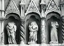 On franchit tout d'abord un portail à voussures, flanqué de niches, puis on pénètre dans l'édifice constitué de trois nefs séparées entre elles par des piliers octogonaux et une série d'arcs brisés.