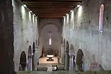 Depuis le narthex, on accède également au véritable intérieur de l'église, qui se compose d'une nef et de deux bas-côtés divisés par des colonnes, avec une abside semi-circulaire. La nef est couverte par des fermes en bois, tandis que les nefs sont voûtées d'arêtes. L'éclairage est assuré par d'étroites fenêtres à simple meneau, six de chaque côté, une autre dans l'abside et deux à l'extrémité des nefs.