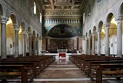 Dans l'abside, se trouvent d'importantes mosaïques du IXe siècle représentant le Christ, les anges et les apôtres, Moïse et Elie, une Vierge à l'Enfant sur le trône et Pascal Ier à genoux dont le nimbe carré autour de la tête indique que le pape était encore en vie au moment de la réalisation de l'œuvre. L'intérieur de la basilique présente aussi des fresques réalisées par Lazzaro Baldi.