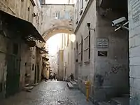 Deux dalles du Lithostrôtos de la forteresse Antonia ont été encastrées au XIIIe siècle dans cette arche pour faciliter aux pèlerins la vénération de ce lieu, entraînant une confusion, ce qui explique que cette construction est connue aujourd'hui sous le nom d'« Arche Ecce Homo »[4]. Ces dalles du Lithostrôtos près de l'arche Ecce homo étant probablement un second Forum dans la partie Est de la cité[5] — identifié comme étant la Place du marché selon l'historien Simon Claude Mimouni[6] — ce qui n'empêche pas les guides touristiques de le présenter vulgairement comme « le Dallage, en hébreu Gabbatha[7] » où Jésus comparut devant Pilate.