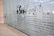 - Les panneaux de verre colorés de quatre versets bibliques en 26 langues[N 14], placés à côté de la porte principale[N 15]. Les versets bibliques sont[11] :