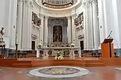 Le presbytère se compose d'un maître-autel de 1773 par Antonio di Lucca (qui a refait celui conçu par Andrea Falcone) qui présente des décorations avec des sculptures de Paolo Persico de 1774 et derrière lequel, dans la zone absidale, il y a une toile sur la Pentecôte par Francesco De Mura. Le long du mur du presbytère, on trouve l'entrée de la sacristie, conçue et entièrement exécutée par Tagliacozzi Canale : maître-autel, parois de meubles du XVIIIe siècle, des peintures du même siècle de Nicola Cacciapuoti et enfin un sol en terre cuite et majolique.