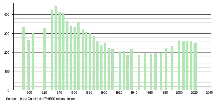 L'évolution du nombre d'habitants est connue à travers les recensements de la population effectués dans la commune depuis 1793. Pour les communes de moins de 10 000 habitants, une enquête de recensement portant sur toute la population est réalisée tous les cinq ans, les populations légales des années intermédiaires étant quant à elles estimées par interpolation ou extrapolation[20]. Pour la commune, le premier recensement exhaustif entrant dans le cadre du nouveau dispositif a été réalisé en 2005[21].