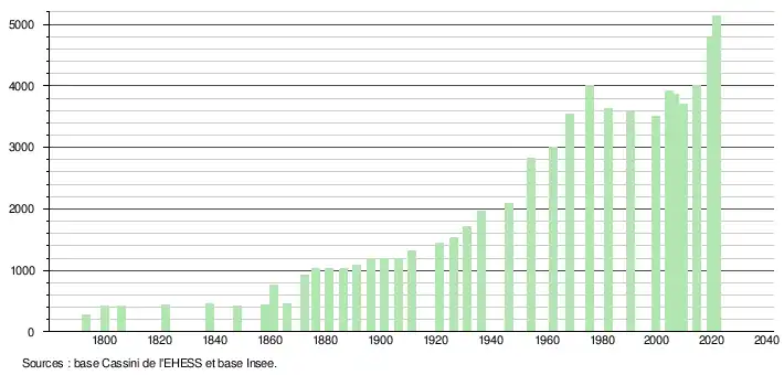 L'évolution du nombre d'habitants est connue à travers les recensements de la population effectués dans la commune depuis 1793. Pour les communes de moins de 10 000 habitants, une enquête de recensement portant sur toute la population est réalisée tous les cinq ans, les populations légales des années intermédiaires étant quant à elles estimées par interpolation ou extrapolation[21]. Pour la commune, le premier recensement exhaustif entrant dans le cadre du nouveau dispositif a été réalisé en 2004[22].