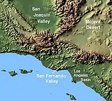 Le bassin, alors immergé, s’est formé au néogène (15 millions d’années). Un mouvement de rotation des montagnes environnantes a entraîné la subsidence par faille de la croûte terrestre et la formation d’une large cuvette, dans laquelle des sédiments marins et terrestres se sont déposés en couches épaisses (11 km aujourd’hui). L’accumulation de micro-organismes pendant cette période a provoqué l’apparition de nappes pétrolifères. Ces nappes ont été exploitées, comme à Wilmington, et sont aujourd’hui quasiment épuisées. Il y a environ 5 millions d’années, un mouvement de subduction a affecté la croûte terrestre et provoqué l’émergence du fond sous-marin constituant le bassin, l’accumulation postérieure de sédiments terrestres formant depuis la couche supérieure du bassin tel qu’il existe aujourd’hui.