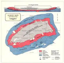 Le bassin de Sudbury s'étend sur 62 km de long, 30 km de large et 15 km de profondeur. Le bassin s’est formé après l’impact d’une météorite (ou plutôt une comète[2],[3]) d'environ 10 à 15 km de diamètre qui s'est produit il y a 1,849 milliard années à l’ère paléoprotérozoïque.