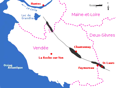 Le bassin houiller s'étend du nord, à l'est du département de la Vendée et déborde sans le sud de la Loire-Atlantique en région française des Pays de la Loire. Il se prolonge également dans l'ouest des Deux-Sèvres en région Nouvelle-Aquitaine.