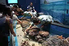 Un bassin tactile est une attraction commune dans les aquariums publics, destinée le plus souvent au jeune public, puisqu'il est conçu pour que le public puisse toucher la faune et la flore vivant dans le bassin. Le bassin, ouvert sur le dessus et peu profond, s'étend à mi-hauteur des visiteurs qui le longent et qui peuvent choisir les organismes avec lesquels ils désirent un contact tactile[1].