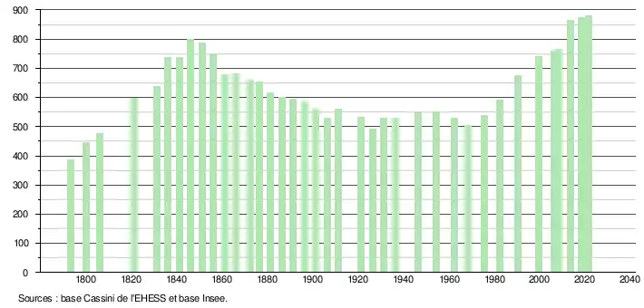 L'évolution du nombre d'habitants est connue à travers les recensements de la population effectués dans la commune depuis 1793. Pour les communes de moins de 10 000 habitants, une enquête de recensement portant sur toute la population est réalisée tous les cinq ans, les populations légales des années intermédiaires étant quant à elles estimées par interpolation ou extrapolation[17]. Pour la commune, le premier recensement exhaustif entrant dans le cadre du nouveau dispositif a été réalisé en 2008[18].