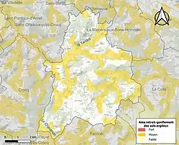 Le retrait-gonflement des sols argileux est susceptible d'engendrer des dommages importants aux bâtiments en cas d’alternance de périodes de sécheresse et de pluie. 36,8 % de la superficie communale est en aléa moyen ou fort (33,6 % au niveau départemental et 48,5 % au niveau national). Sur les 161 bâtiments dénombrés sur la commune en 2019, 25 sont en aléa moyen ou fort, soit 16 %, à comparer aux 25 % au niveau départemental et 54 % au niveau national. Une cartographie de l'exposition du territoire national au retrait gonflement des sols argileux est disponible sur le site du BRGM[16],[Carte 2].