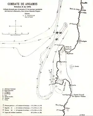 - (en)/(es) Cet article est partiellement ou en totalité issu des articles intitulés en anglais « Battle of Angamos » (voir la liste des auteurs) et en espagnol « Combate naval de Angamos » (voir la liste des auteurs).