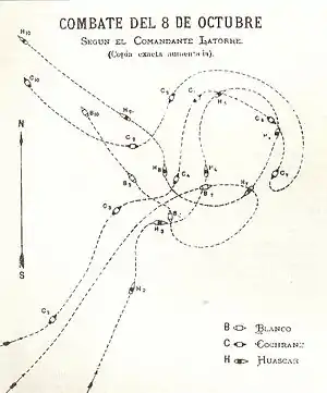 À l'aube du mercredi 8 octobre, les navires de guerre péruviens naviguaient vers le nord. À 15 h 30, les navires péruviens Huáscar et Unión sont aperçus dans des directions opposées, sous le commandement du contre-amiral Grau.
