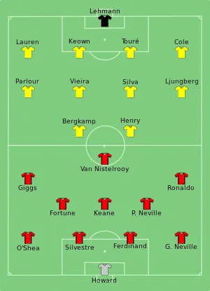 Quand Cristiano Ronaldo a été victime d'une faute sur le côté droit à 35 mètres du but à la 13e minute, Ryan Giggs s'est vu offrir la première opportunité du match, son coup franc s'est écrasé sur l'extérieur du poteau[11]. Une autre faute sur Ronaldo a donné à Giggs une autre chance de faire pression avec un autre coup franc peu de temps après, mais Ruud van Nistelrooy a fait passer le ballon au-dessus du but avec sa tête[11]. Le jeu offensif d'Arsenal manquait de son ambition habituelle[13], avec sa meilleure opportunité à la 75e minute, lorsqu'une touche habile de Dennis Bergkamp a presque fait entrer Patrick Vieira dans la surface de réparation adverse[11].