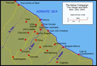 L'offensive de la 8e armée britannique sur les lignes défensives de la ligne Gustave à l'est des Apennins avait débuté le 23 novembre avec la traversée du fleuve Sangro. À la fin du mois, les principales défenses de la ligne Gustave avaient été percées et les troupes alliées progressent vers la rivière Moro, se trouvant à 6,4 km au nord de la ville d'Ortona. Lors de la traversée de la rivière Moro au début du mois de décembre 1943, la 78e Division d'infanterie britannique, positionnée sur le flanc droit allié de la côte Adriatique avait été secourue/remplacée par la 1re Division d'infanterie canadienne, sous les ordres du major-général Christopher Vokes[5]. À la mi-décembre, après des combats acharnés dans le froid et la boue, la 1re Brigade d'infanterie canadienne se fraye un chemin à 3,2 km d'Ortona et est relayée par la 2e Brigade d'infanterie pour procéder à la prise de la ville[6].