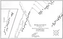 D'Orvilliers appareille le mercredi [8],[9] et aperçoit pour la première fois la flotte de Keppel le 23 à 1 h de l'après-midi, alors qu'il se trouve à 90 milles dans l'ouest-nord-ouest d'Ouessant. Les manœuvres continuent jusqu'au lundi 27 juillet au matin. Les Français vont nord-ouest, les Britanniques sous leur vent, marchant à l'ouest, bâbord amures, en échiquier. D'Orvilliers ordonne son armée de manière très classique. La première escadre, bleue et blanche, à l'avant-garde, la sienne, la blanche, au centre du dispositif et celle du duc de Chartres, la bleue, à l'arrière-garde. D'Orvilliers ordonne d'abord d'abattre sur la flotte anglaise en virant lof pour lof, ce qui fait perdre quelque peu l'avantage du vent[10]. Mais à peine l'ordre de bataille reformé, d'Orvilliers s'aperçoit que l'avant-garde anglaise fond sur son arrière-garde. Il ordonne alors le renversement sur place de l'ordre de bataille, ce qui transforme son escadre bleue en avant-garde et oblige les Britanniques à se mettre en ligne, tribord amures. Les deux flottes commencent à se croiser vers onze heures, et l'artillerie à gronder. La force du vent fait gîter les navires, ce qui empêche les Français d'ouvrir les sabords de leurs batteries basses, où sont les plus gros canons. Les Britanniques n'ont pas cette gêne, la gîte de leurs navires est du côté opposé au combat, mais la fumée revient sur eux.