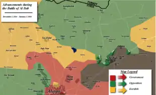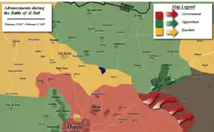 De leur côté, les forces du régime syrien, commandées par le général Souheil al-Hassan, commencent également à progresser en direction d'al-Bab[57]. Le 2 février, après 20 jours de combats, l'armée syrienne affirme avoir avancé sur 16 kilomètres depuis l'autoroute d'Alep et repris 32 villages et hameaux soit une superficie de 250 km2[58]. Elle n'est alors plus qu'à 3 kilomètres d'al-Bab[59]. Les Turcs et les rebelles lancent alors une nouvelle offensive au sud-est de la ville, afin de couper la route aux troupes du régime syrien[59].