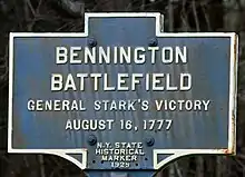 Le est un jour férié légal dans le Vermont, appelé Bennington Battle Day[48]. Le champ de bataille, aujourd'hui site historique de l'État de New York, entra dans le registre des National Historic Landmarks le , et fut ajouté sur le Registre national des lieux historiques le [49],[50]. Dans les années 1870, la société historique locale de Bennington fit construire le Bennington Battle Monument, qui fut achevé en 1889 et inauguré en 1891 par des cérémonies auxquelles assista le Président des États-Unis Benjamin Harrison. Le Monument, un obélisque de 93 mètres de haut, est aussi inscrit au National Register of Historic Places[50],[51]. Bien que le monument ne fût pas prêt à temps pour marquer le centenaire de la bataille, à cette date anniversaire eurent lieu des discours auxquels assista le Président Rutherford B. Hayes[52].