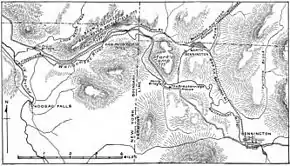 Les soldats allemands quittèrent le camp de Burgoyne à Fort Edward le et marchèrent vers Fort Miller, où ils patientèrent jusqu'à l'arrivée des Amérindiens et d'une compagnie de tireurs d'élite britanniques. Ensuite, ils se dirigèrent vers Bennington le [22]. À l'occasion de petites escarmouches sur le chemin, ils apprirent des prisonniers qu'ils avaient capturés qu'une grande force était présente à Bennington[23]. Le les hommes de Baum rencontrèrent un détachement des forces de Stark, qui avait été envoyé pour vérifier des rapports faisant état de la présence d'Amérindiens dans la région. Les forces de Stark se retirèrent et détruisirent un pont afin de retarder l'avancée de Baum. Apprenant l'arrivée de l'ennemi, Stark envoya une demande de renfort à Manchester, puis fit sortir son armée de Bennington et mit en place une ligne de défense[4]. Baum envoya un message à Burgoyne après le premier contact, lui indiquant que les forces américaines étaient plus importantes que prévu, mais qu'elles allaient probablement battre retraite. Il avança alors quelques kilomètres plus loin, approchant des positions américaines, et réalisa sur le moment que son premier message était au moins partiellement incorrect ; aussi en envoya-t-il un second, dans lequel il demandait des renforts[24].