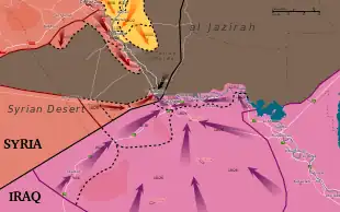 En Irak, une offensive est également lancée le 26 octobre par l'armée irakienne et les milices chiites des Hachd al-Chaabi contre la dernière poche tenue par l'État islamique à l'ouest de la province d'Al-Anbar[10]. Le 3 novembre, la ville d'al-Qaïm, située près de la frontière syrienne, face à la ville de Boukamal, est reprise par les forces gouvernementales irakiennes[11].