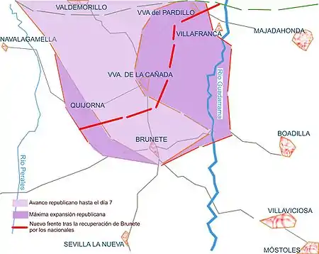 Afin de reprendre l'avantage, les nationalistes envoient la 5e brigade de Navarre soutenir la garnison de Villafranca del Castillo : ils arrivent à repousser les républicains jusqu'à la Guadarrama. Entre le 12 et le 17 juillet, il devient de plus en plus clair que l'avancée républicaine s'essouffle, d'autant que certains objectifs sont atteints : Brunete est tombé et la route de l'Estrémadure est coupée. Les hommes du général Miaja décident alors de fortifier leurs positions en attendant la contre-offensive nationaliste.