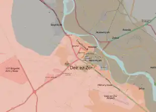 Le 17 septembre, les loyalistes reprennent le village d'al-Jafra, à l'est de l'aéroport, et atteignent les rives de l'Euphrate ; les djihadistes se retrouvent alors à leur tour presque encerclés et acculés contre le fleuve[179]. Le 18 septembre, malgré les avertissements des FDS, les troupes du régime syrien franchissent l'Euphrate au sud-est de Deir ez-Zor[180]. Le même jour, les loyalistes s'emparent de l'île d'Hawija Sakr, à l'est de Deir ez-Zor, qui est alors contrôlée à 75 % par le régime selon l'OSDH[181],[182],[183].