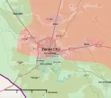 Les rassemblements anti-Assad se poursuivent pendant la seconde partie de l'année 2011 et des soldats-déserteurs de l'Armée syrienne libre apparaissent[16]. Au début de l'été 2011, paralysée par les désertions, l'armée est contrainte d'abandonner plusieurs quartiers à Deraa[37]. Pendant plusieurs années, la ville est divisée en deux parties, le nord est contrôlé par les loyalistes et le sud par les rebelles[38],[1].
