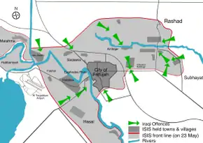 Le 26 mai, l'État islamique perd la ville de Garma, à 16 kilomètres de Falloujah[20]. Selon la coalition, 20 bombardements touchent Falloujah du 23 au 27 mai, tuant 70 djihadistes, dont Maher Al-Bilawi, commandant des forces de l'EI dans cette ville[21]. Les combats ont lieu principalement au sud et au nord-ouest de la ville, dans les environs de Saklaouiya[22]. Le 31 mai, l'armée irakienne affirme avoir repoussé une contre-attaque des djihadistes sur la localité de Naimiyah, à 500 mètres du quartier de Chouhada, au sud de Falloujah, et tué 75 hommes sur les 100 qui auraient participé à cet assaut[23],[24].