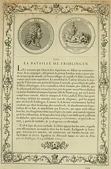 La bataille de Friedlingen (de) s'est déroulée le près de la ville de Weil-am-Rhein, (Allemagne) quelques km au nord de Bâle (Suisse). L'armée française menée par Claude Louis Hector de Villars, vainquit celle du Saint Empire, menée par Louis-Guillaume Ier de Bade.